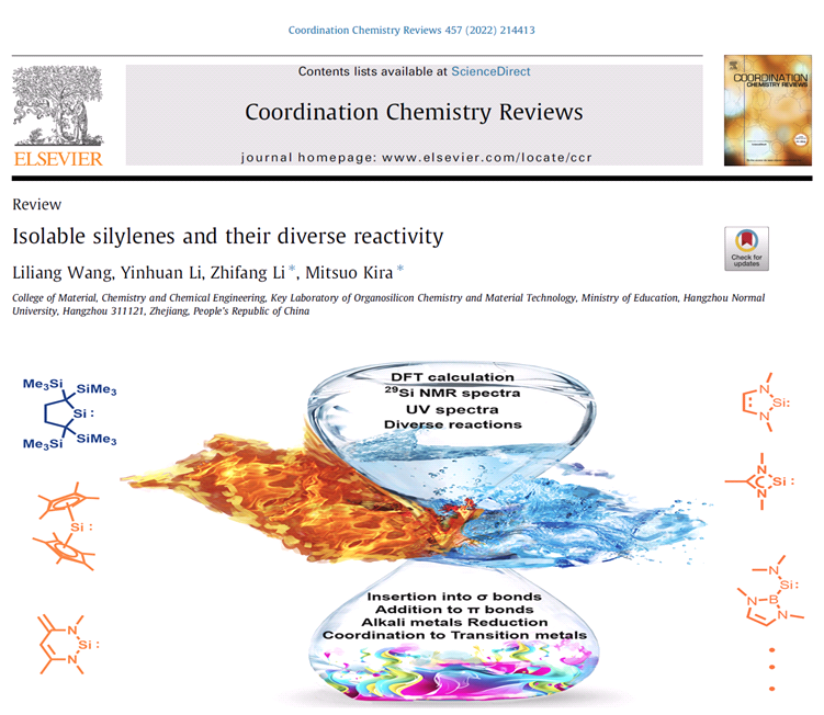 论文以“Isolable silylenes and their diverse reactivity”为题发表在《Coordination Chemistry Reviews》(IF: 22.315)。该期刊是Elsevier出版社旗下的顶级期刊,在化学研究领域深具影响力,被认为是化学化工领域顶级期刊之一。论文第一作者为材料与化学化工学院青年教师王立亮博士,通讯作者为李志芳教授和吉良满夫教授,杭州师范大学为第一通讯单位。论文受到国家自然科学基金(22071039和22101068)和浙江省自然基金(LY19B020007 和LQ21B020007)的资助。